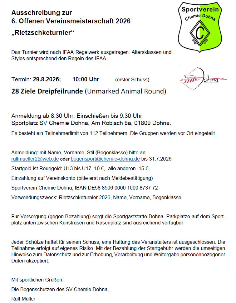 Am 30.8.205 steht wieder unsere offene Vereinsmeisterschaft auf dem Programm. Nach den Regelwerk der IFAA (Feldbogenverband) wird es eine Runde mit 28 3D-Zielen und unbekannten Entfernungen. Dazu ein schöner Sonderschuss mit Extra-Wertung.