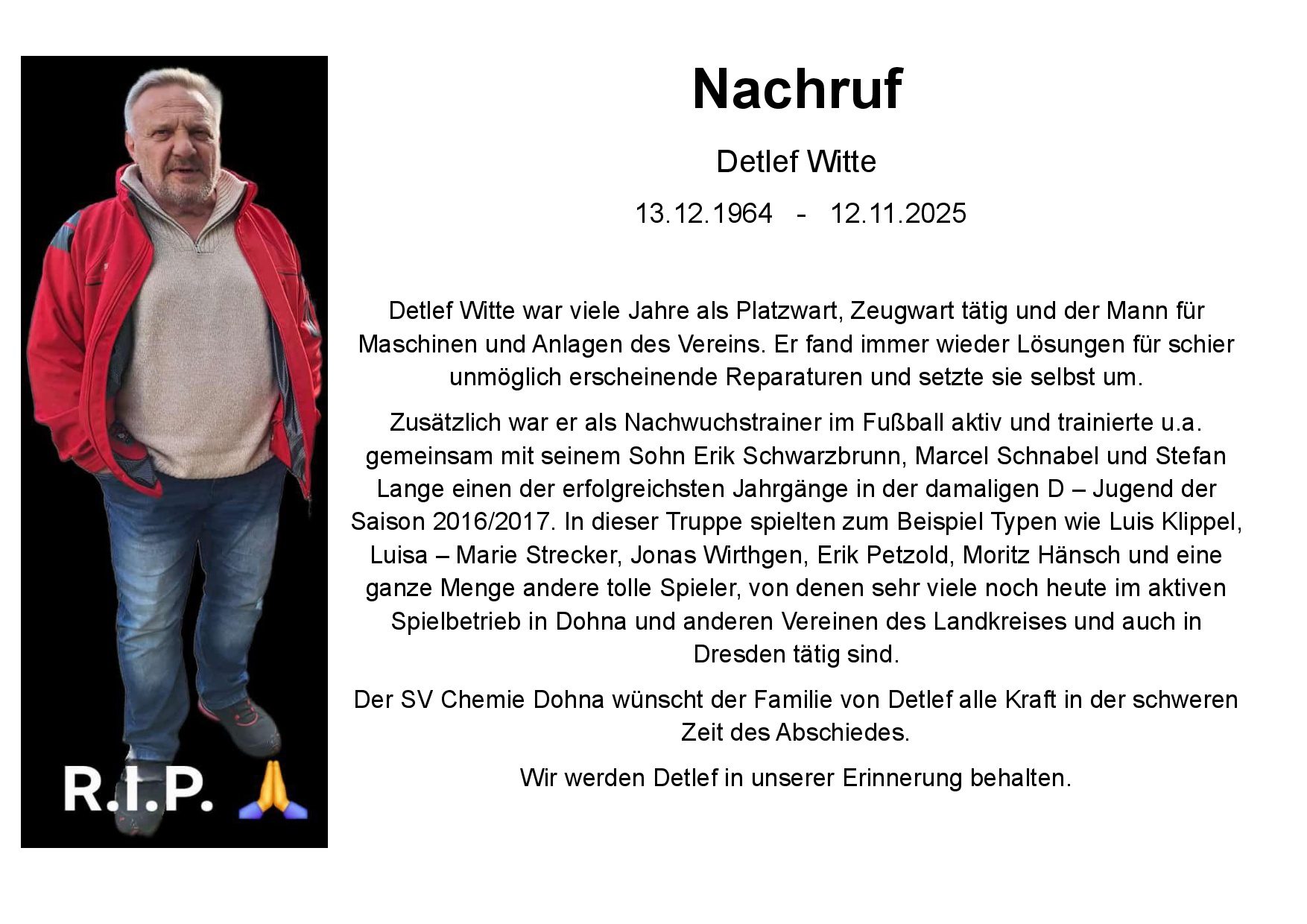 Wir danken unseren ehemaligen Spielern, Maik Ritter (wechselt in die 2. Mannschaft), Joel Salomon (unbekannt), Tom Tippner (wechselt zu VfL Pirna Copitz) und unserem ehemaligen Trainer Nico Kessler (wechselt zu VfL Pirna Copitz) für ihre Leistungen und ihr Engagement um den Klassenerhalt der 1. Mannschaft in der Sachsenklasse Ost zu sichern.